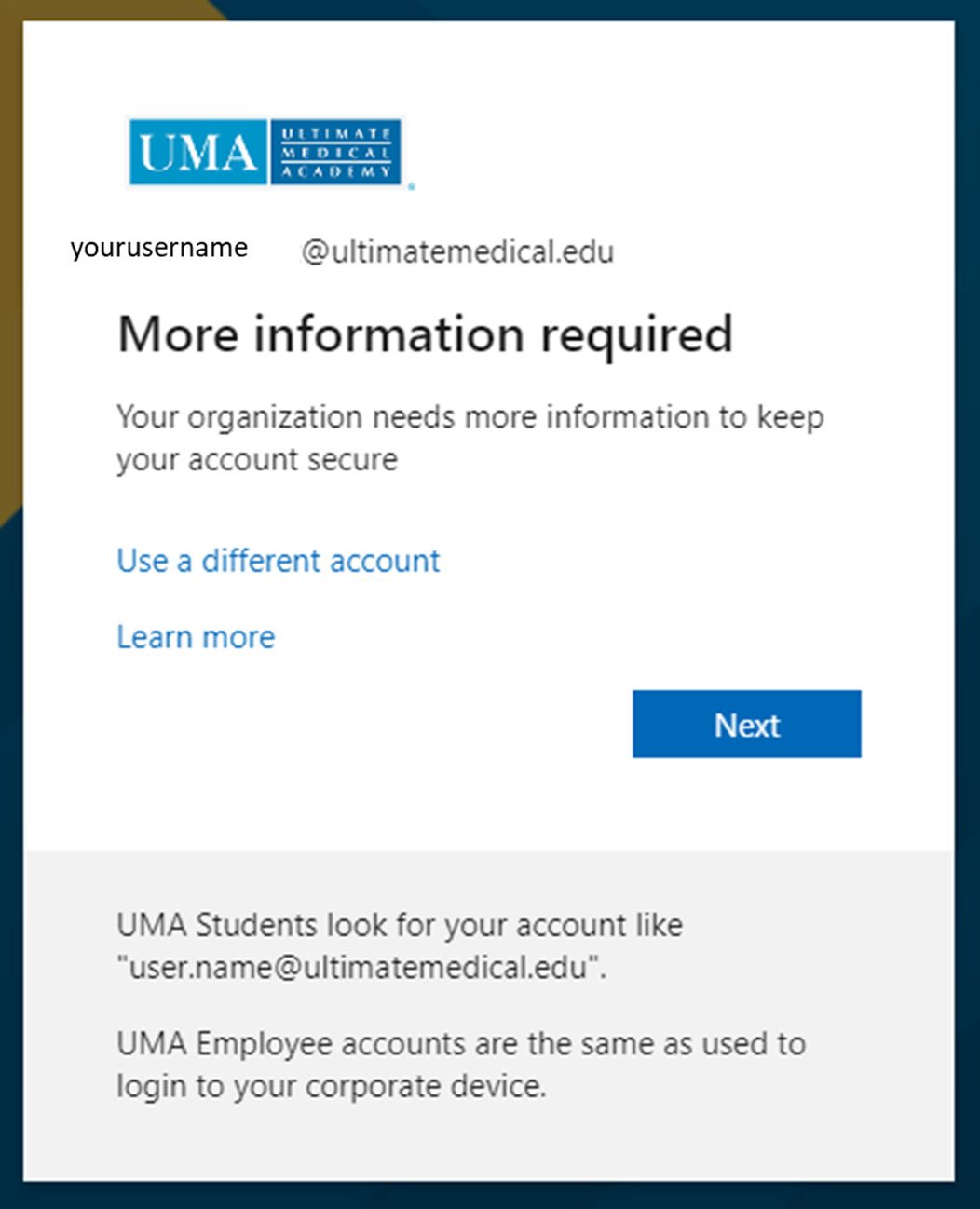 1. After logging in, you will see a prompt screen that says “More information required,” click “Next”.