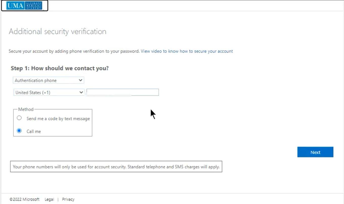 2. Next, you will see a screen that says “Additional security verification screen.” Click the down arrow and select “Authentication phone.” On the box, drop down to United States (+1) which is at the top of the list. Please input your personal phone number including the area code and in the method box you can select “send me a code by text message” or “call me” and click “Next.”