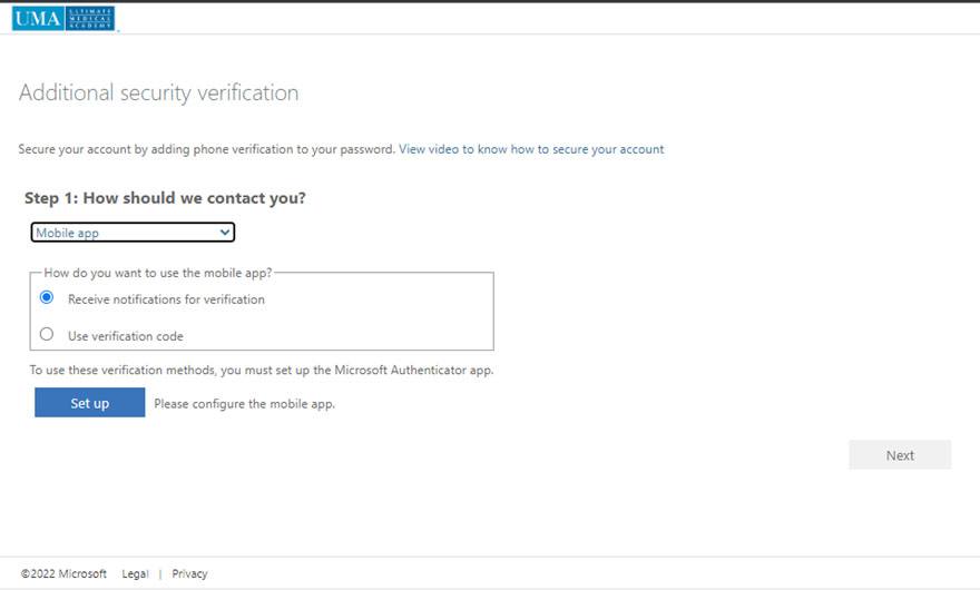 1. When you first open either the PUMA Den or Outlook from your mobile device, you will be prompted to add additional security verification. Select Mobile App under Step 1: How should we contact you?
