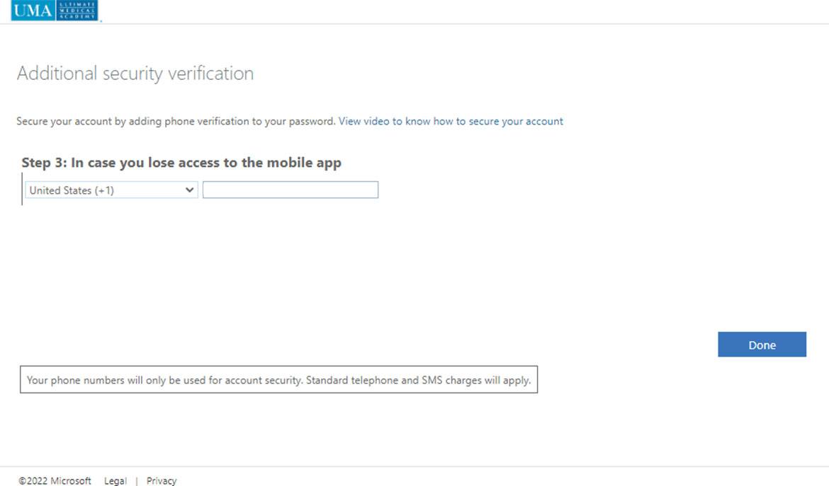 8. Add your phone number to the “Step 3: In case you lose access to the mobile app” area, and then select “Next.” Microsoft recommends adding your phone number to act as a backup if you’re unable to use the mobile app for any reason.