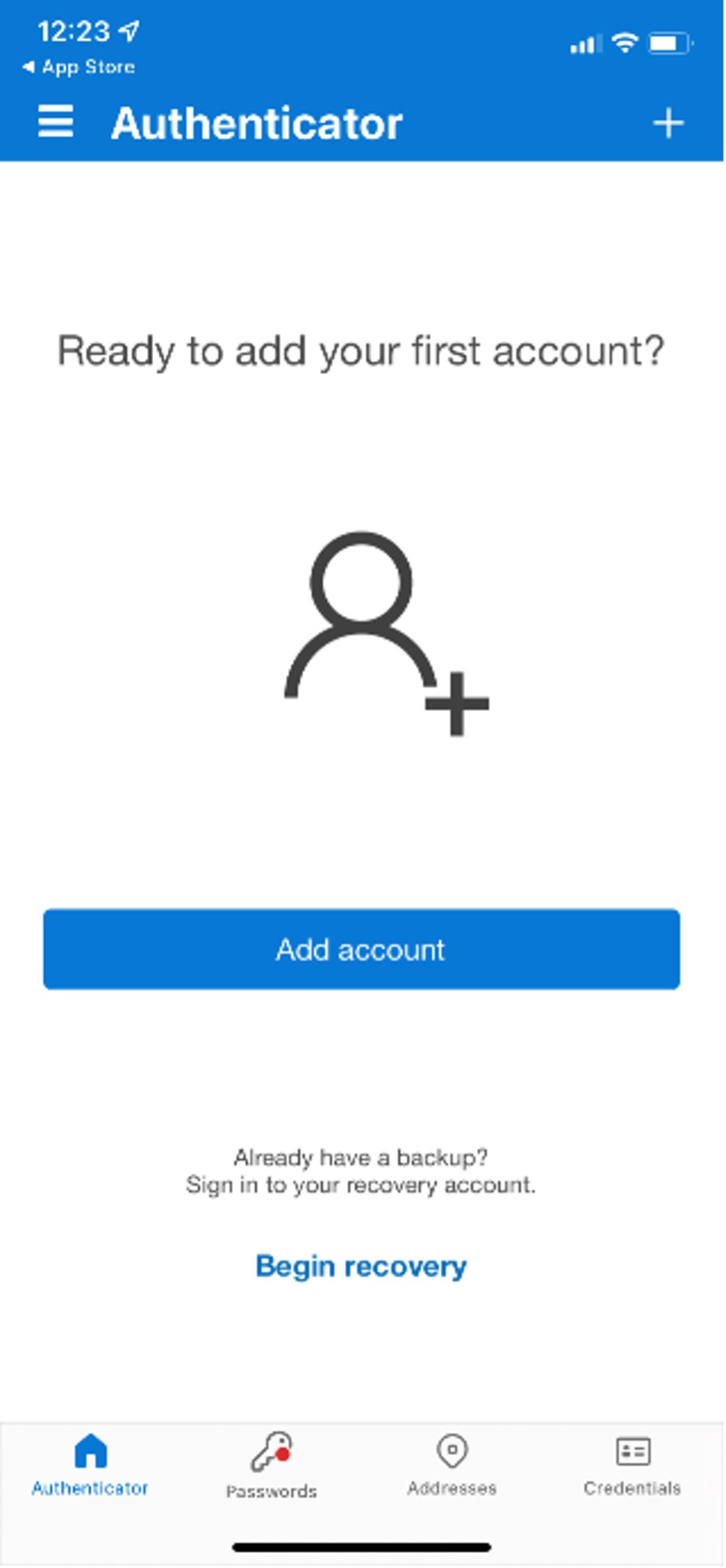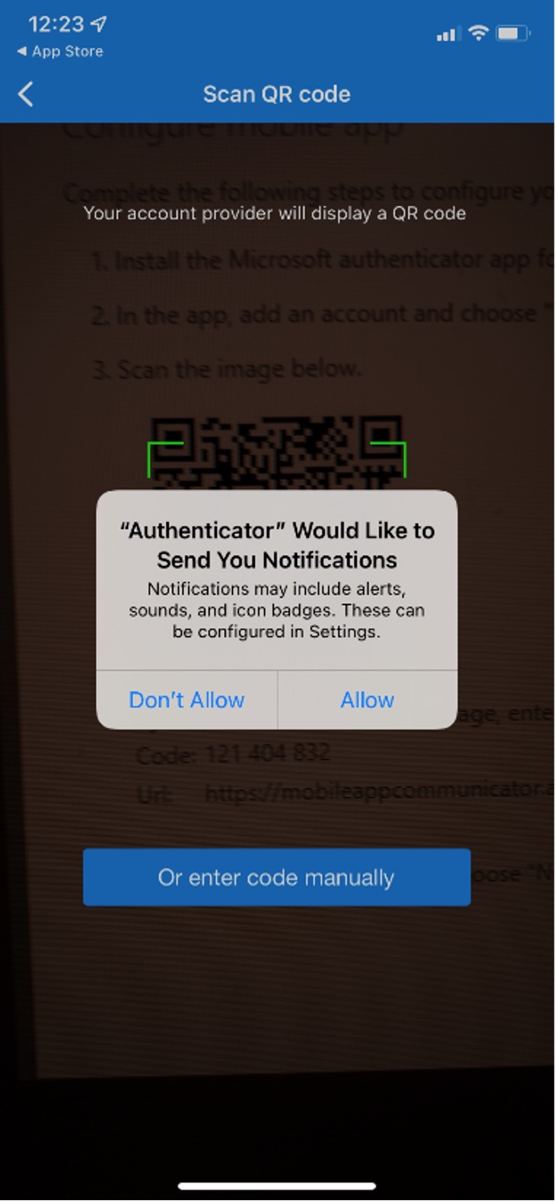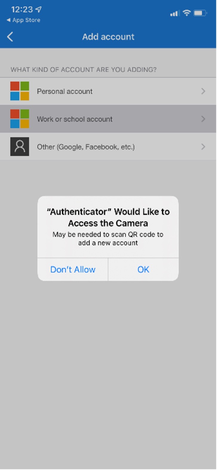 Note: If you receive a prompt asking whether to allow the app to access your camera (iOS) or to allow the app to take pictures and record video (Android), select “Allow” so the authenticator app can access your camera to take picture of QR code in next step.
