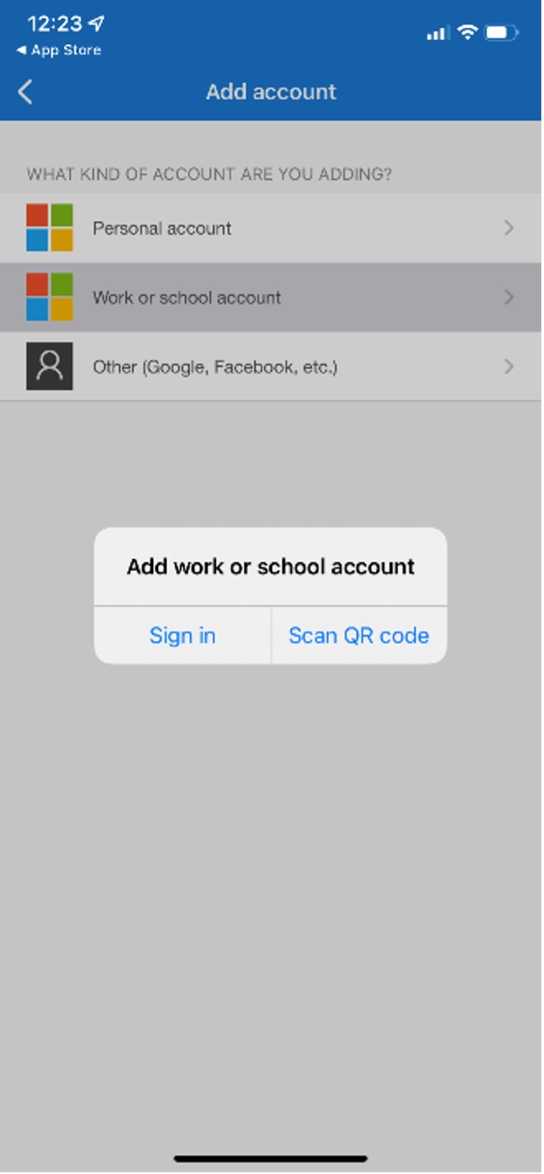 4. Go to your smart device, open the Microsoft Authenticator app, select “Add account” from the customized menu and control icon in the upper-right, and then select “School account.”